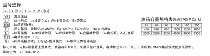 標(biāo)記示例:電機-泵裝置上置立式,郵箱容積160升,采用單級葉片泵,電動機功率2.2千瓦,工作壓力6.3MPa集成塊式的液壓泵站。