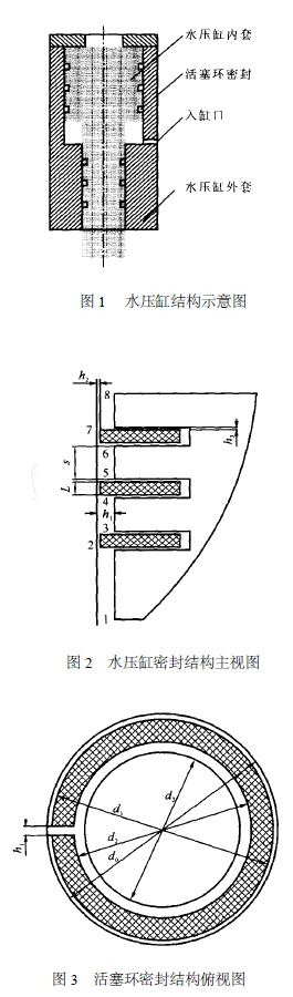 1 理論分析水壓缸結(jié)構(gòu)示意圖示于圖1 ,水壓缸上下兩端的密封均由3 道活塞環(huán)及4 條環(huán)形間縫隙組成。取一端為研究對象,結(jié)構(gòu)示于圖2 、3 。