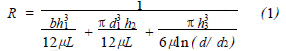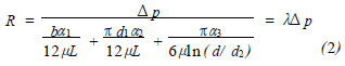 1) 通過活塞環(huán)本身切口h1 處的泄漏。該泄漏可視為平行平面間的縫隙流動。在層流狀態(tài)下, 流量與壓力之間的關(guān)系為QV1 = bh13 Δp/12μL 。定義此處的流阻[6 ] R1 = Δp/ QV1 = 12μL/bh13 。式中: QV 為體積流量; b 為縫隙流道的寬度, b = d1 - d2/2 ; h1 為活塞環(huán)切口寬度;Δp 為切口兩端的壓差;μ為水的粘度; L 為活塞環(huán)高; d2 、 d1 分別為活塞環(huán)的內(nèi)、外直徑。