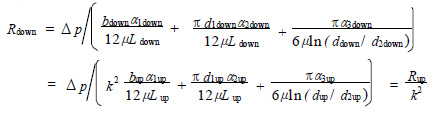 水壓缸兩端密封為兩個并聯(lián)的流阻,且其結(jié)構(gòu)參數(shù)間存在著線性比例關(guān)系, 比例因子 k = 0. 733 。由于水壓缸單端密封的流阻主要集中在3 道活塞環(huán)上,因此,取其中1 道活塞環(huán)為研究對象,下標“up”表示水壓缸上端活塞環(huán)密封,下標“down”表示水壓缸下端活塞環(huán)密封, 則由式(2) 可知: