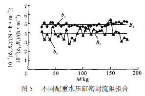 在控制棒水壓驅(qū)動機構(gòu)單缸步進性能實驗[7 ] 中,從開始充壓到水壓缸內(nèi)套動作這一段時間定義為步升前充壓時間,在此段時間內(nèi),由于水壓缸內(nèi)套未動作,回路中入缸流量等于泄漏流量,利用不同配重步升過程中的實驗數(shù)據(jù)即可求出水壓缸活塞環(huán)密封的泄漏流阻。用最小二乘法來擬合不同配重步升前充壓時間內(nèi)的( R ,Δp) , 自變量為Δp , 函數(shù)為R = Δp/QV ,求出各個配重下的流阻擬合公式, 即不同配重實驗所對應(yīng)的b0 和b1 值, 擬合結(jié)果示于圖5 , 其中, M 為配重??梢钥闯?對幾何結(jié)構(gòu)一定的活塞環(huán)密封結(jié)構(gòu)而言,不同配重實驗所對應(yīng)的b0 和b1 值基本不變。取它們的平均值, B0 和B1 為計算公式中的系數(shù)。