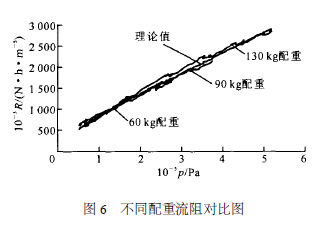 圖6 為60 、90 和130 kg 配重實驗結(jié)果與理論公式計算所得流阻的對比曲線。該曲線顯示,實驗結(jié)果與公式計算結(jié)果吻合得很好。同時,可以看出,隨著配重的增加,步升開始所需壓力逐漸增大,步升前充壓時間逐漸變長,流阻對應(yīng)的壓力范圍隨之逐漸增大。